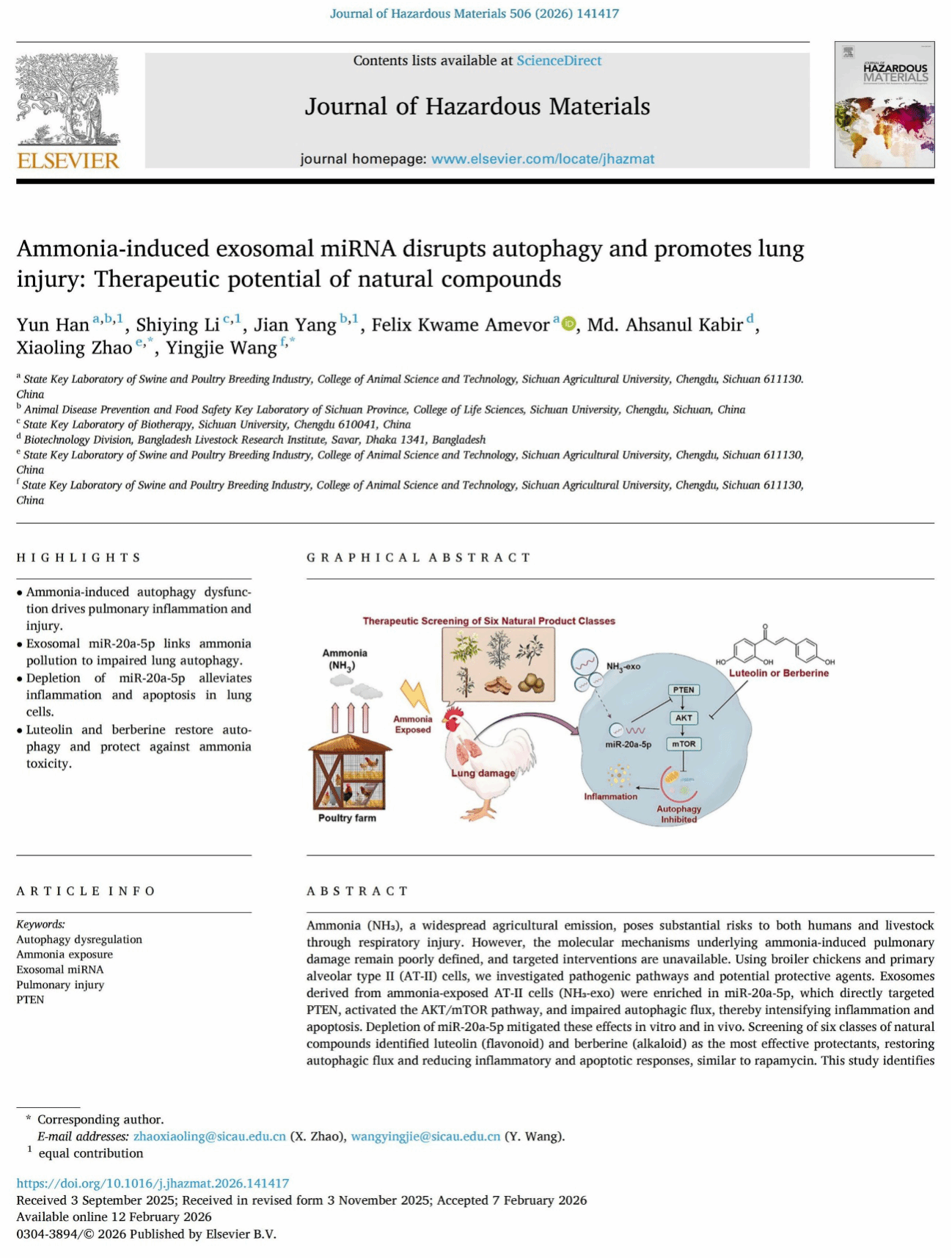 随着畜牧业集约化、机械化养殖的推进,肉鸡高密度饲养成为常见的养殖形式。近日,我校肉鸡育种与健康养殖团队聚焦高密度养殖过程中氨气对肉鸡健康产生胁迫的行业痛点,系统揭示了氨气诱导肺损伤的分子机制,并进一步筛选出具有干预潜力的天然活性物质,为绿色防控提供了明确路径。相关成果《Ammonia-induced exosomal miRNA disrupts autophagy and promotes lung injury: Therapeutic potential of natural compounds》发表于权威期刊《Journal of Hazardous Materials》(IF=11.3,中科院大类分区一区Top杂志)。我校为该论文的第一完成单位,学院赵小玲教授、王英杰特聘研究员为共同通讯作者。