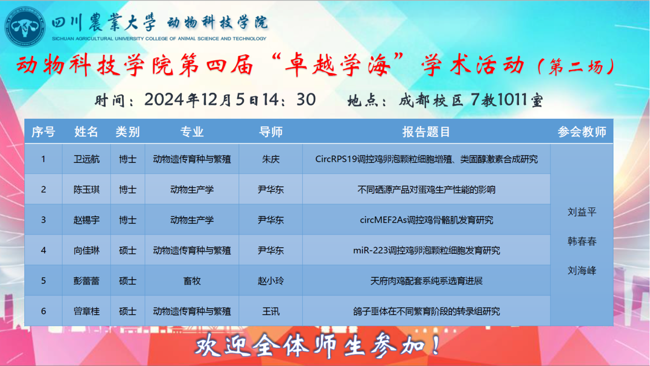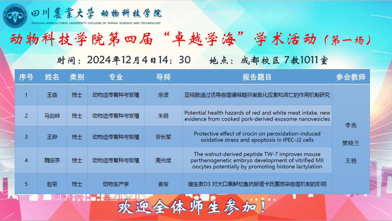 本次学术活动,进一步加强了学院师生之间的科研交流,共同分享和了解研究成果,极大地激发了研究生对动物学科研究的积极性和主动性。同时,在本次学术交流过程中锻炼了报告人的学术交流能力,认可了自我价值,为学院营造了良好的学术氛围。