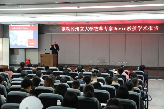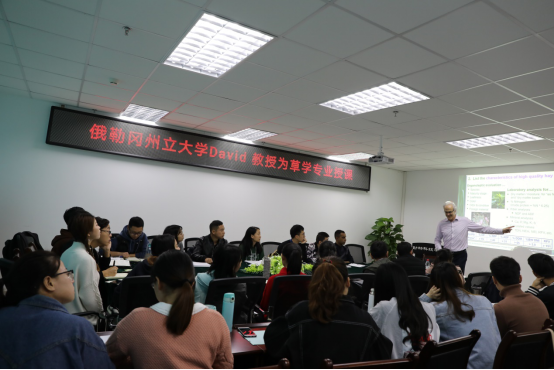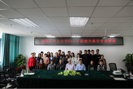 来访期间,David教授为草学20余名研究生讲授《Forage & Grassland sciences》课程(40学时),内容主要包括牧草的重要性、世界草地类型、不同牧草的特点及混播草种的选择、植物的生长和再生等。David教授课堂采用全英文PPT结合板书的授课形式,讲授语言风趣幽默,课堂气氛宽松,学生参与积极,教学效果良好。尤其对2位巴基斯坦留学生,极大地提高了同学们学习专业知识的积极性和参与性,并对草学学科及世界牧草领域有了全新的认识。同学们表示,David教授不单是牧草方面的杰出专家,业务精湛,学术渊博,治学严谨,也是中国通,有着浓厚的人文艺术底蕴,为同学们的学习和生活态度树立榜样,指明方向。