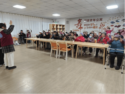 互动环节中,志愿者陈卓然化身领操员,带领老人们一同学习简单的手语操,伴随着轻快的节奏,老人们抬手、摆臂,在轻松的肢体活动中活络身心,现场满是欢声笑语。随后的合唱环节将氛围推向小高潮,志愿者与老人们齐声唱响《学习雷锋好榜样》等经典老歌,熟悉的旋律回荡在现场,老人们跟着节奏轻声和唱,脸上洋溢着幸福的笑容。