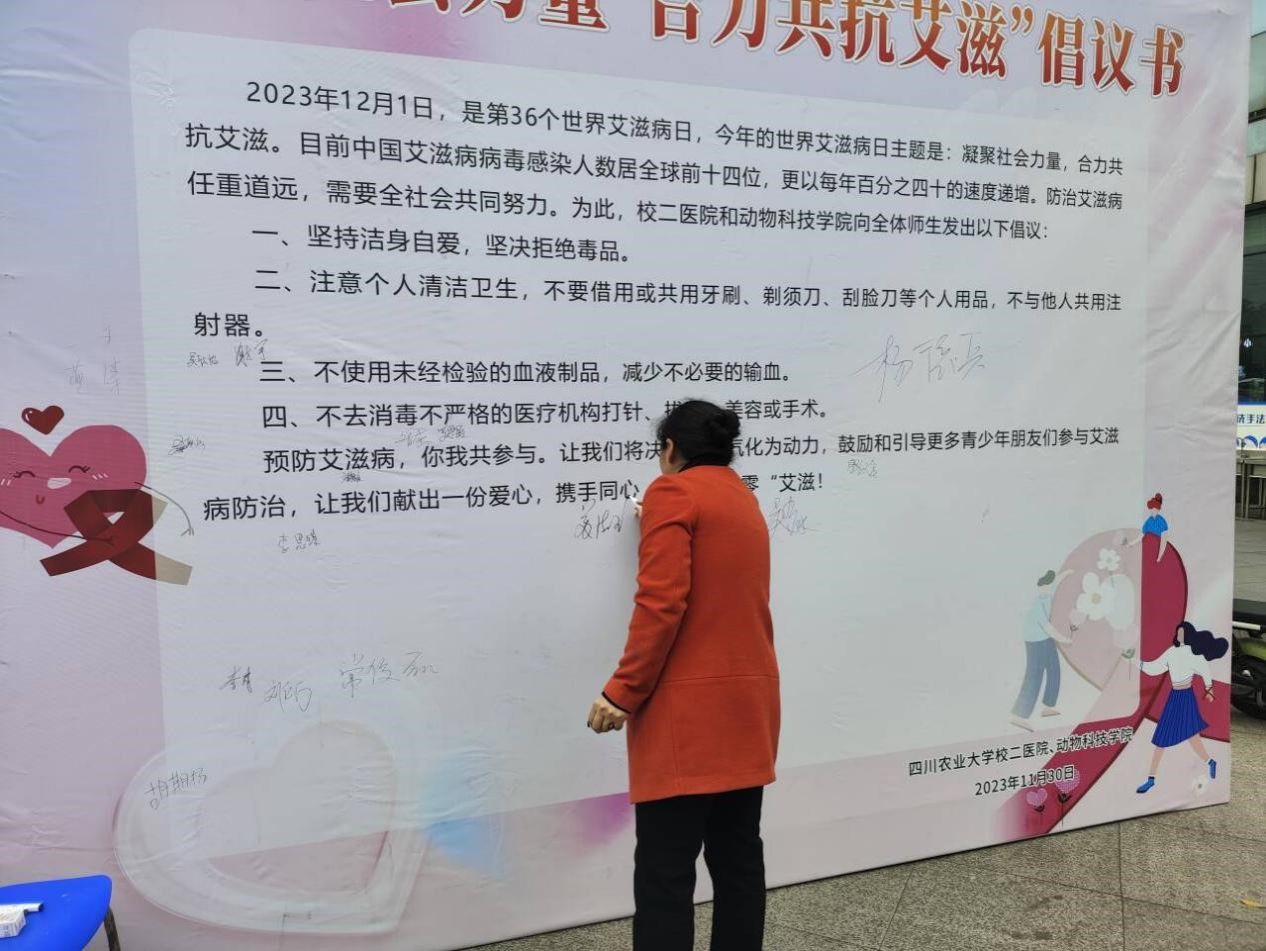 青春有爱,健康无艾。动科学院团委青年志愿者工作部和校二医院于11月30日,线下开展了签字活动,同学们积极在倡议书上签下自己的名字,每一个名字都代表着一份承诺,彰显了同学们加强防艾意识、共抗艾滋的决心与信心。签倡议书的同学们纷纷表示:只要我们每个人都尽一份力,就能够创造一个更加美好的世界。与此同时,志愿者们邀请同学们参与到抽取奖品的活动中,大家热情洋溢,进一步营造了“人人参与、人人关心、人人带头、共同抗艾”良好校园氛围。