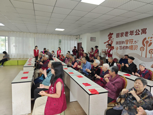 志愿者们迈着轻松的步伐,身着红色马甲走进颐家老年公寓。活动室内,老人们早已坐齐等待,手里摇晃着小国旗,表达着对志愿者到来的热情。活动伊始,老人们向志愿者们展示了他们近期学习的“金龙拍拍操”,动作缓慢却整齐,现场洋溢着欢快的氛围。随后,志愿者们为老人们演唱了《歌唱祖国》、《我爱你中国》、《红星闪闪》等经典红歌。熟悉的曲调串联起温暖的记忆,志愿者们以铿锵有力的歌声,抒发对祖国的热爱、传递对老人们的美好祝愿。