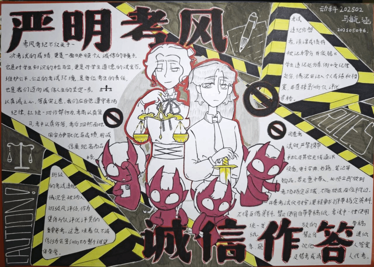 “绘诚润心田,丹青树新风”。青年们以笔为媒、以画传情。鲜明的主题、生动的图案、精炼的文字,阐释考风考纪的重要意义,普及诚信应考的行为准则,将“严明考风考纪,筑牢诚信防线”的理念可视化、通俗化,营造了诚实守信的考试氛围。