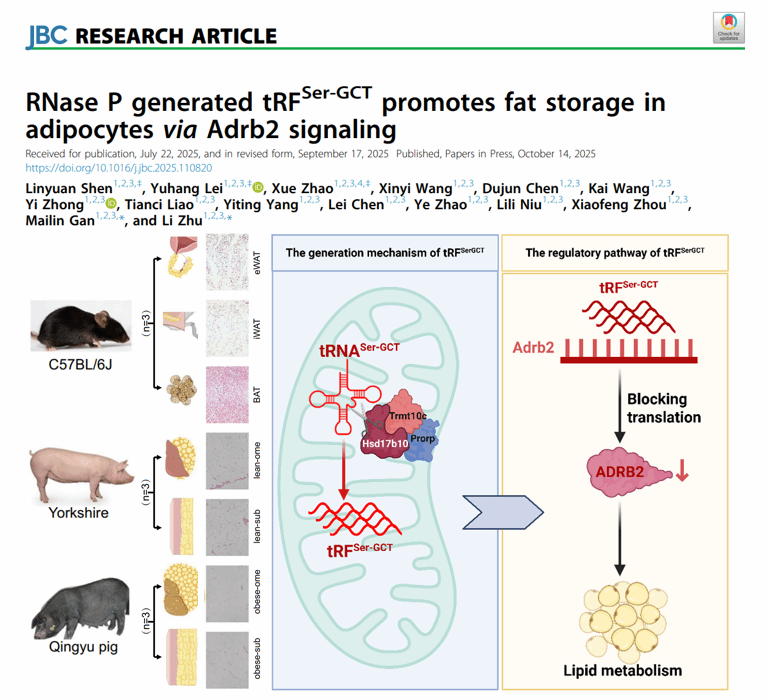 围绕上述科学问题,朱砺课题组系统开展了tsRNA参与脂肪沉积调控的相关研究。在发表于Cellular & Molecular Biology Letters的研究中(题为“A novel tRF-Gly is associated with obesity development through post-transcriptional regulation of lipid metabolism”),团队以猪为研究对象,结合脂肪组织tRF & tiRNA测序分析,筛选并鉴定出在脂肪型青峪猪的内脏脂肪中极高表达的tRF-Gly-GCC-037(tRF-Gly)。功能与机制研究表明,tRF-Gly可通过转录后调控方式影响脂肪生成相关因子的表达,并参与RAC1/Wnt/β-catenin信号通路调节,从而在脂肪沉积过程中发挥调控作用。在此基础上,课题组在Journal of Biological Chemistry发表的研究论文(题为“RNase P generated tRFSer-GCT promotes fat storage in adipocytes via Adrb2 signaling”),从分子机制层面进一步揭示了脂肪沉积相关tsRNA特异性表达的上游生物发生机制。研究表明,线粒体来源的tsRNA可通过特定RNA酶(RNase P)加工剪切生成,并通过调控下游Adrb2相关信号通路影响脂肪细胞分化及脂质积累过程,为理解线粒体来源的tsRNA在脂肪代谢中的作用机制提供了新的研究思路。
