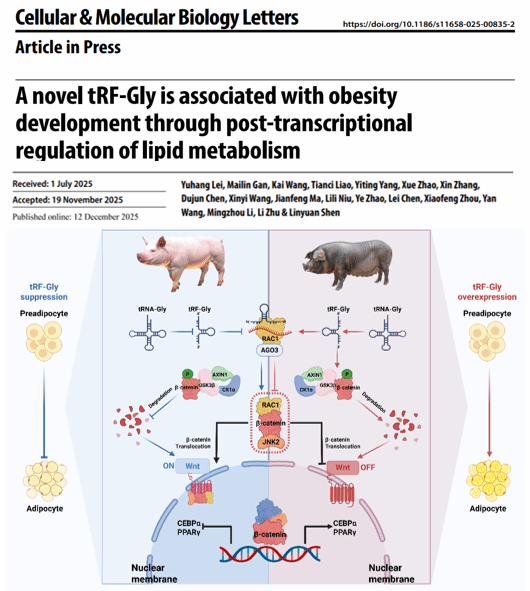 【科学研究】学院朱砺教授团队揭示tsRNA调控猪脂肪沉积的新型表观遗传机制