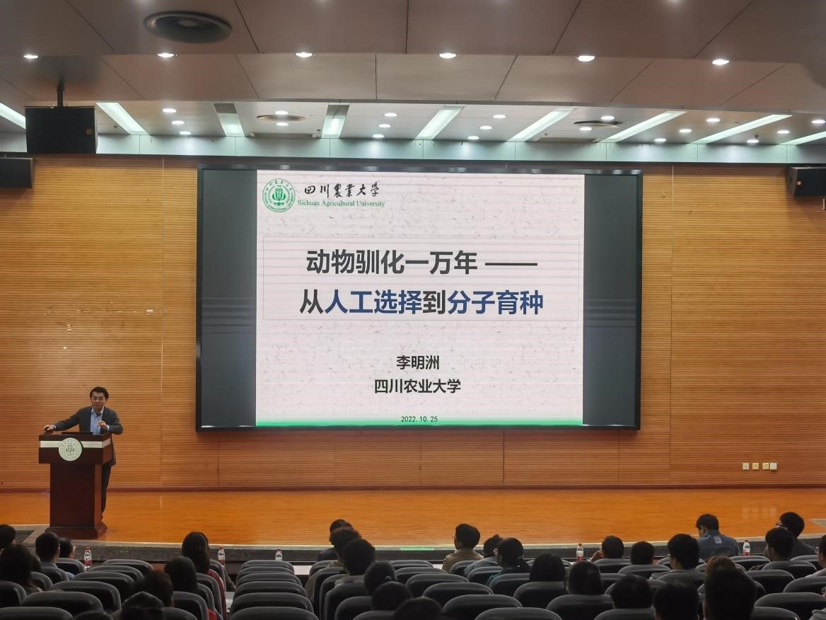 “四川是养猪大省,全国每10头猪中就有1头产自四川。‘中国碗’装‘中国粮’,‘中国猪’用‘中国种’,猪粮安天下”,李明洲以《动物驯化一万年:从人工选择到分子育种》为专题,从动物驯化历史实践、科学研究、技术攻关、产品研发、人类健康等方面进行了讲解,开启了同学们对动物科学专业学习和科学研究的序幕。“巧夺天工的基因组编辑——大自然要千百万年才能完成的工作,现在人们能在几周之内完成,现代的动物科学研究不只是提供肉蛋奶,在农业和人类营养健康、抗病性、疾病治疗、器官移植等方面还有更大的研究空间”,李明洲最后期望同学们要保持对科学充满好奇,对知识充满渴求,和一群志同道合的人一起探寻一个个未知。