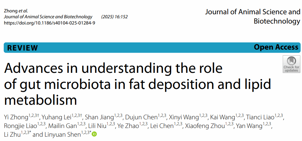 近日,学院朱砺教授课题组在畜牧领域知名期刊《Journal of Animal Science and Biotechnology》(中国科技期刊卓越行动计划梯队期刊,中国科学院一区Top,影响因子6.5)发表综述论文,题为“Advances in understanding the role of gut microbiota in fat deposition and lipid metabolism”。论文第一作者为2022级本科生钟易。此外,该生还以主要作者身份参与发表SCI论文2篇,其中含自然指数期刊论文1篇,影响因子大于10的一区论文1篇。