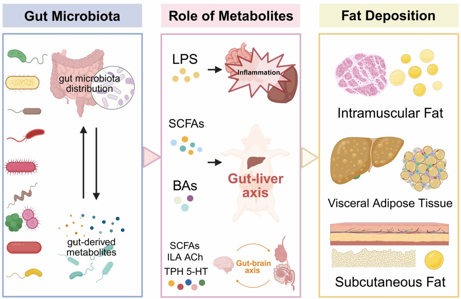 该论文系统梳理了肠道菌群在调控猪和家禽脂肪沉积及脂质代谢中的关键作用。文章指出,不同肠道菌群组成及其代谢产物,如短链脂肪酸(SCFAs)和二级胆汁酸(LCA、HDCA等),可通过“肠-肝-脑”多器官网络影响脂肪的合成、分解与分布。其中,FXR/TGR5双受体信号通路在能量代谢与脂肪调控中起核心枢纽作用。论文系列总结了多种典型菌群的部位特异性功能,如Clostridium butyricum能通过产丁酸及重塑菌群结构抑制皮下和内脏脂肪沉积,而Bacteroides uniformis与Pyramidobacter piscolens则促进肌内脂肪形成,影响肉品质。论文还提出了“可操作变量-目标性状”证据矩阵,为通过益生菌、营养干预等手段实现精准脂肪调控提供了理论框架。该综述为畜禽脂肪沉积的分子调控研究与优质猪肉生产实践提供了重要参考。